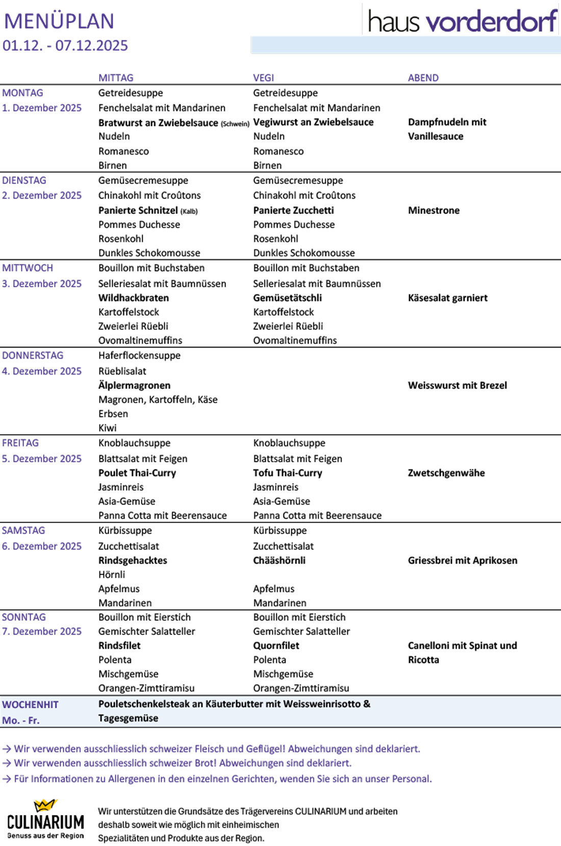 Wir sind Mitglied von „Culinarium“ und kennzeichnen in unserem Menüplan jeweils speziell die regionalen Culinarium-Zutaten aus.